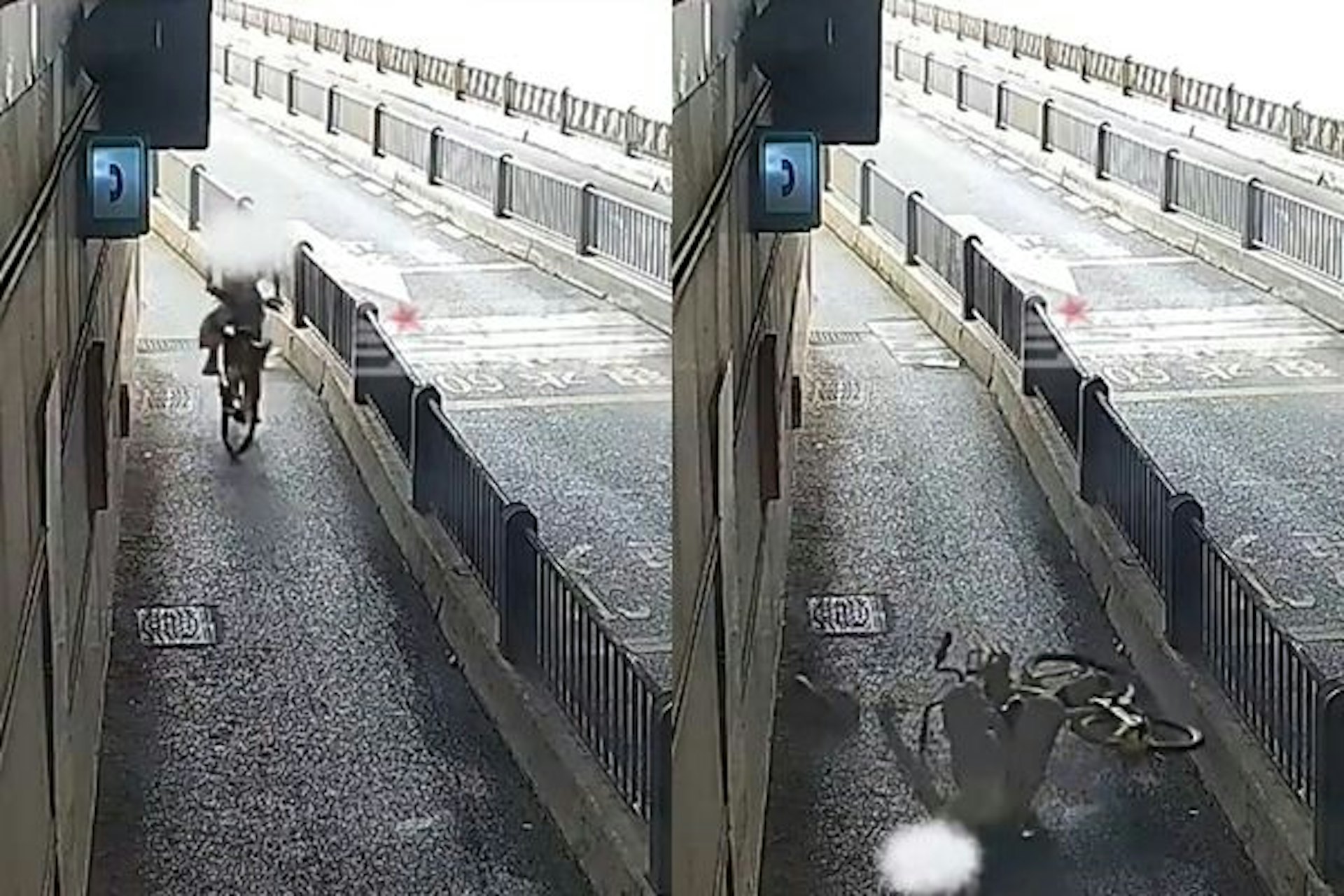 女子拿手機騎單車,過彎重摔慘死。(微博圖片)