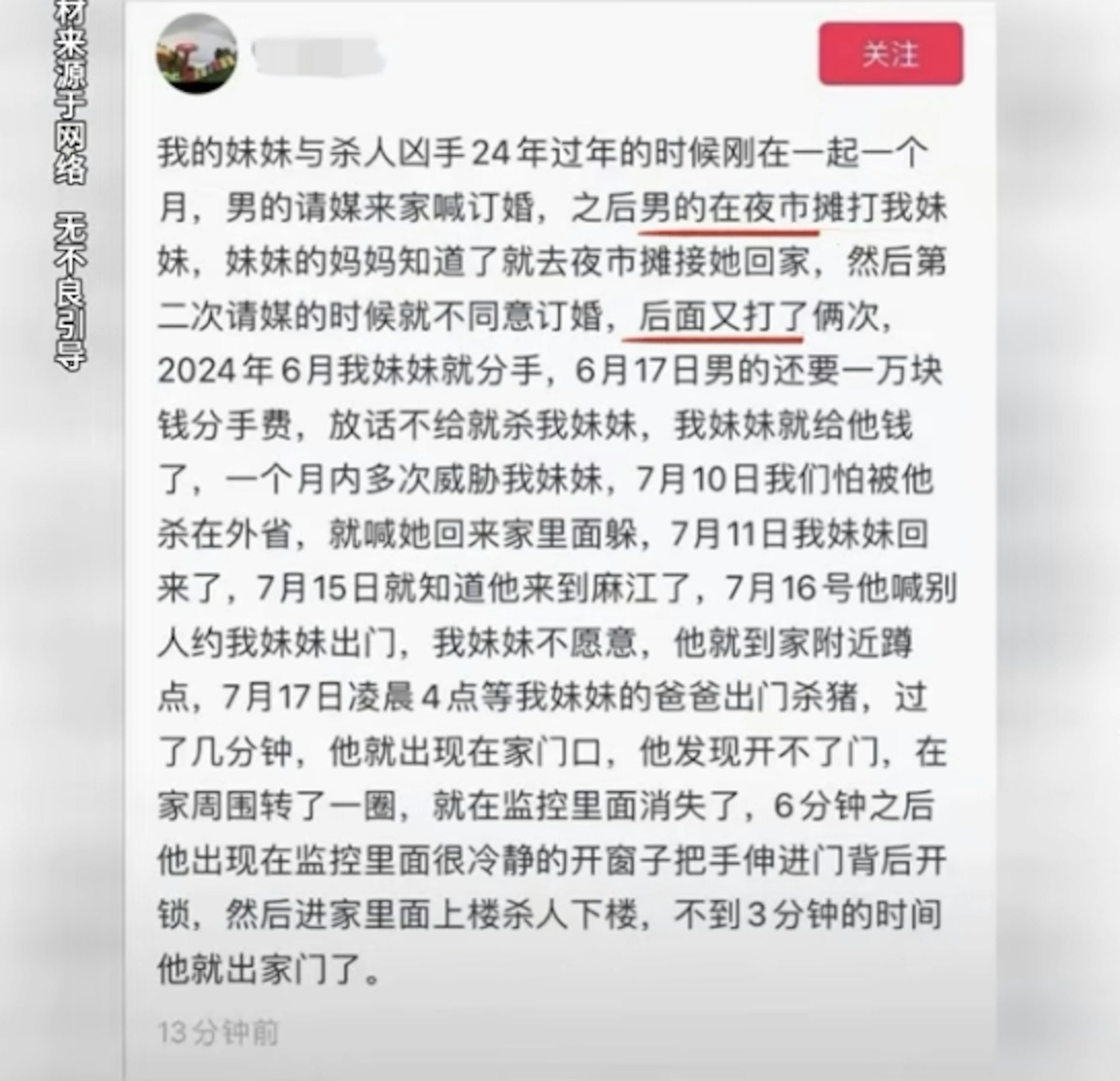 多名網民發聲稱,22歲女家屬楊某被曾和其訂婚的男子宋某某持刀殺害。(影片截圖)2 M+ K; `2 Q6 B