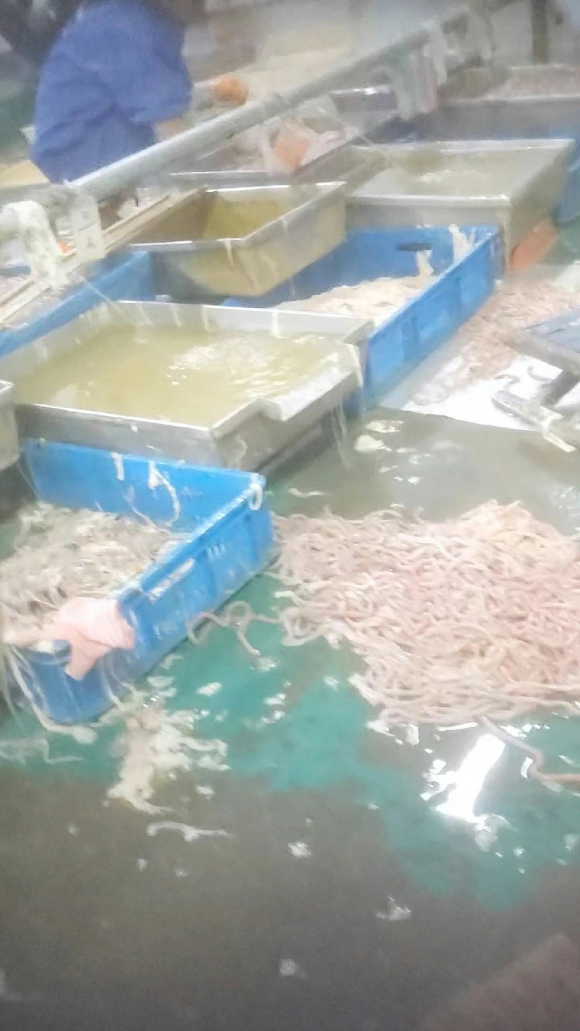 鵝腸車間工人穿膠鞋踩洗鵝腸。(新京報)