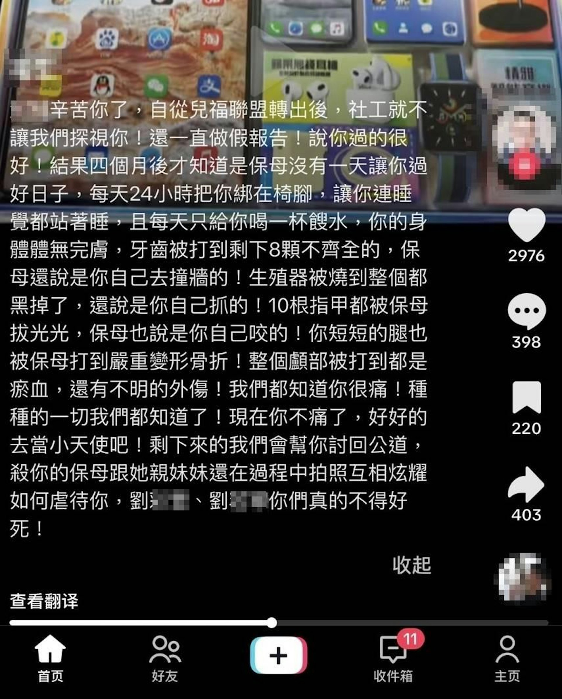 據了解,2023年9月,凱凱經社會局轉介兒童福利聯盟劉姓保母照護,沒想到3個月不到,就把凱凱活活虐死,送到醫院時還辯稱凱凱只是噎奶,檢察官會同法醫相驗後,發現劉姓姊妹說謊,不但涉嫌虐童致死,還有勾串家人、滅證等嫌疑,先後將2人收押禁見。; c0 o5 s S5 i9 }6 q, u