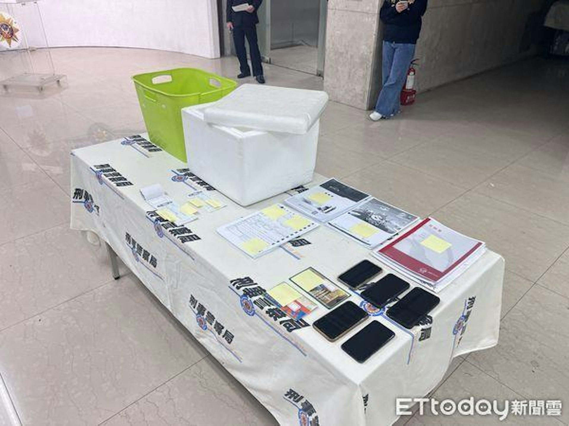 , N- P; f# q. k* r- K o0 f+ Z公仔箱論壇警方查扣涉案裝乾冰的白色箱子、浸泡乾冰用的綠色塑膠桶等證物。(《ETtoday新聞雲》)