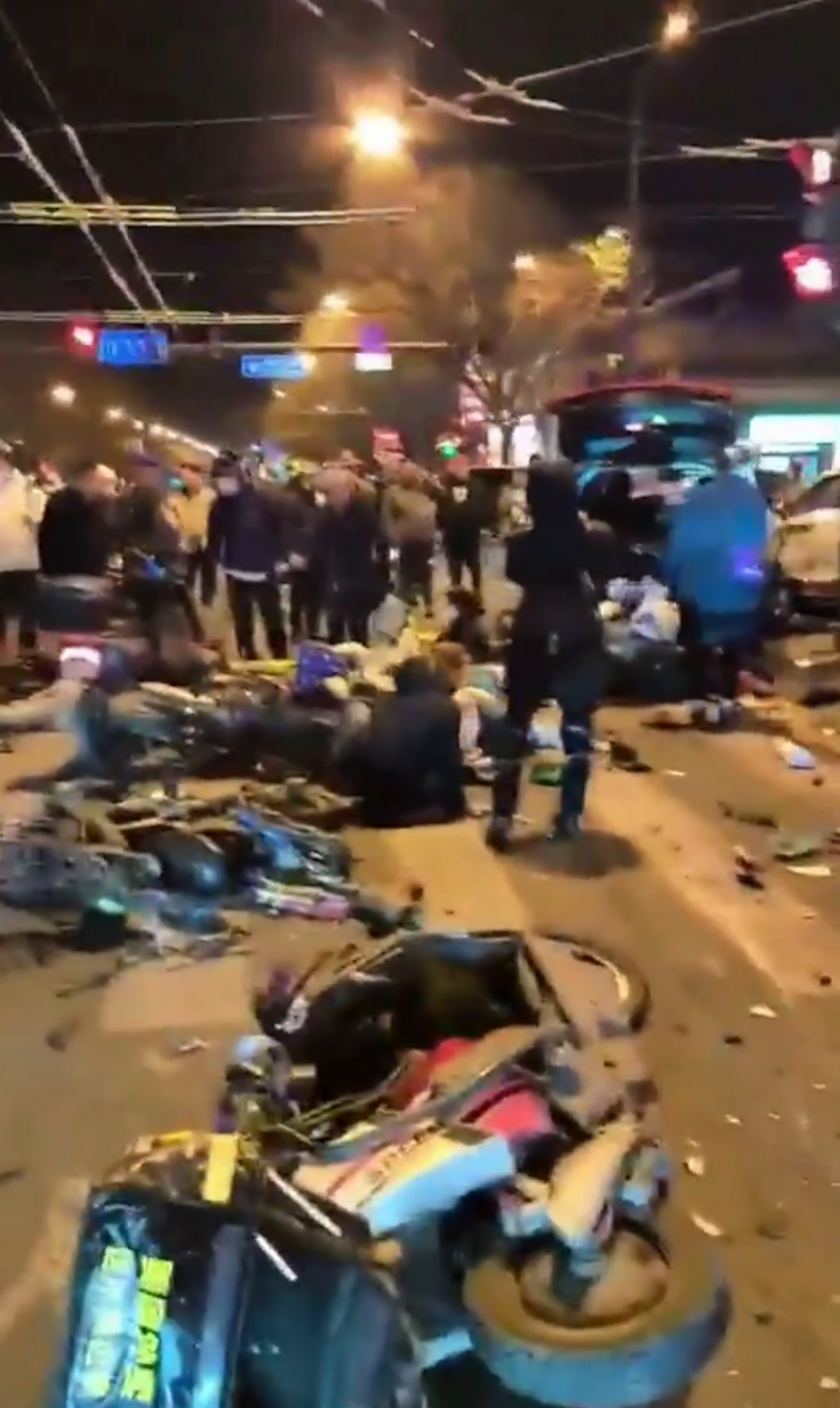 網傳影片顯示,車禍現場一片狼藉,大量電動單車被撞翻,疑似多名電動單車司機倒地不起,現場傳出哭聲,且路面有明顯血迹。+25.39.217.778 }! r" |/ u) @ e3 Y