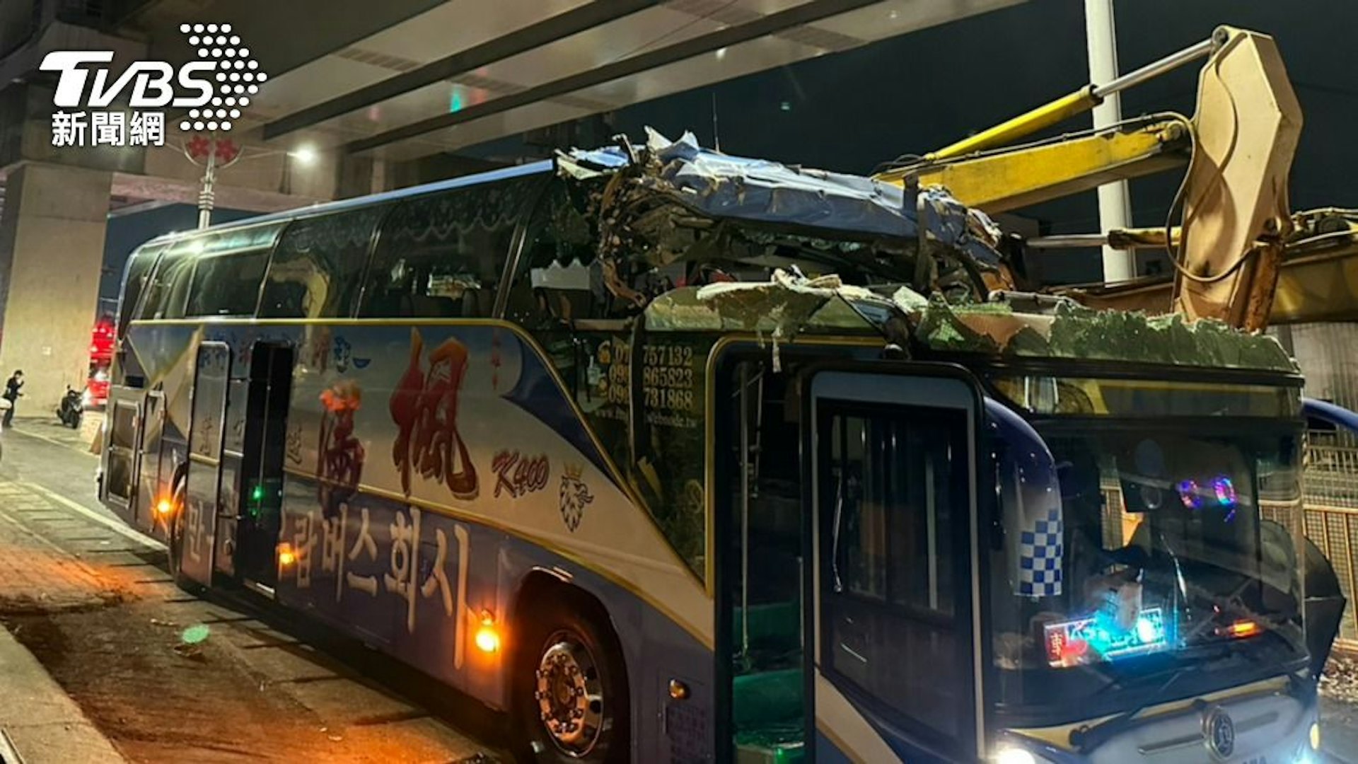 台灣高雄市20日(周三)晚間8時許發生一宗嚴重交通事故,一輛旅遊巴疑似撞上高速公路下方限高2米的隧道,導致車頭嚴重毀損。(《ETtoday新聞雲》)