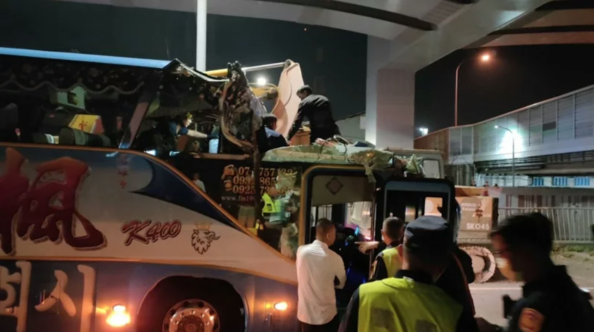 台灣高雄市20日(周三)晚間8時許發生一宗嚴重交通事故,一輛旅遊巴疑似撞上高速公路下方限高2米的隧道,強大的衝擊力道令車頭遭「削平」一部分,車上1名80歲男子當場死亡,另有14人受傷,傷者送往醫院救治,詳細事故原因仍待釐清。