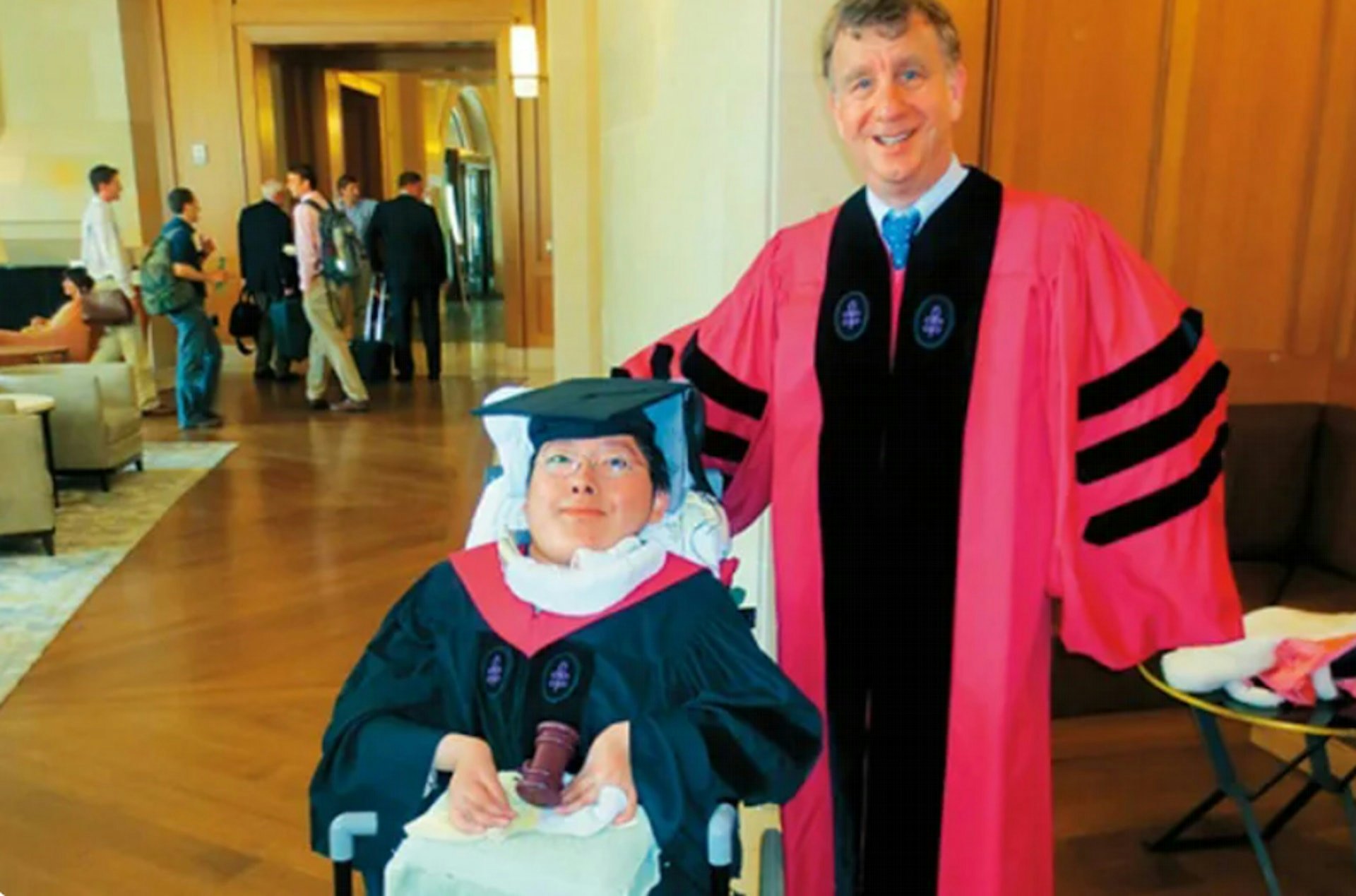 7 y2 F! e# B/ ^2 `# ^7 R5.39.217.77患有罕見疾病「先天性脊髓性肌肉萎縮症」的陳俊翰,被譽為台版「非常律師」。圖為陳俊翰(左)2014年獲律師執照返台 。(資料照/罕病基金會提供)
