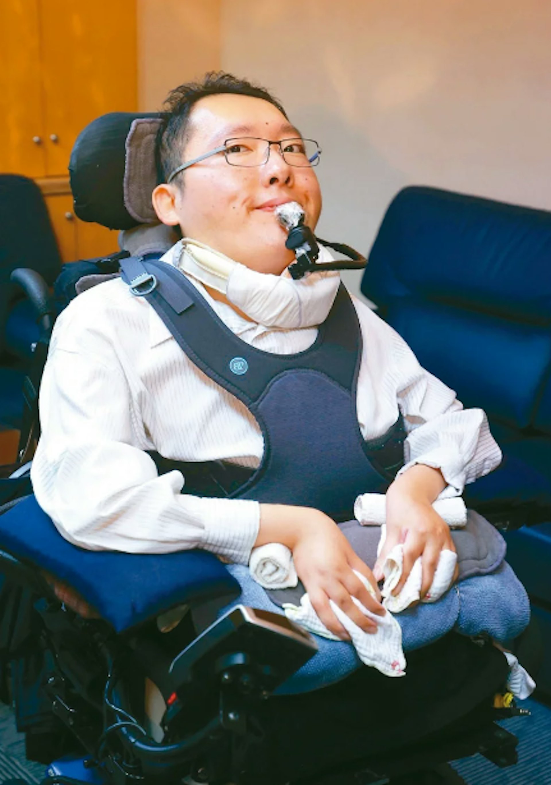 9 Z4 R! L; g4 Q9 u& J5 {+ |患有罕見疾病「先天性脊髓性肌肉萎縮症」的陳俊翰,被譽為台版「非常律師」。(《聯合報》)