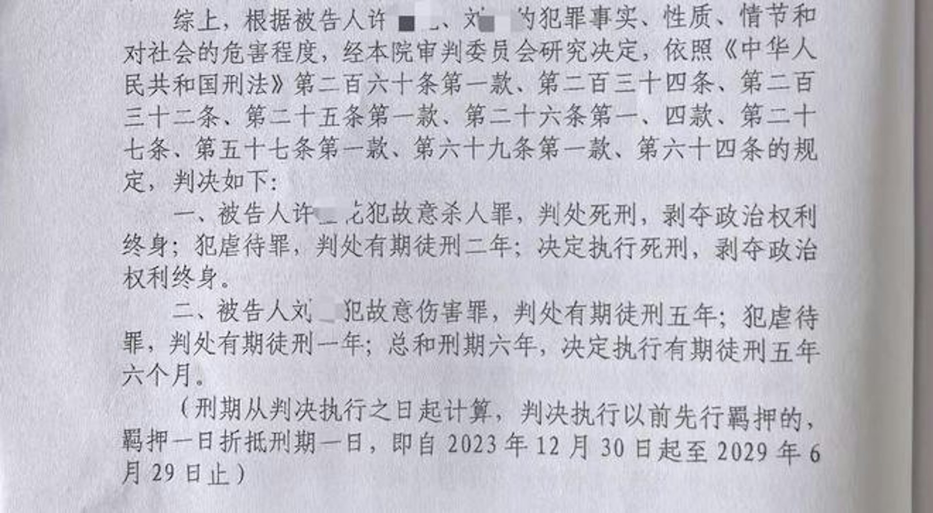 + O, i- h( r, G3 D6 I最終,一審法院判決許某花犯故意殺人罪和虐待罪,決定執行死刑,剝奪政治權利終身;劉某犯故意傷害罪和虐待罪,決定執行有期徒刑五年六個月。