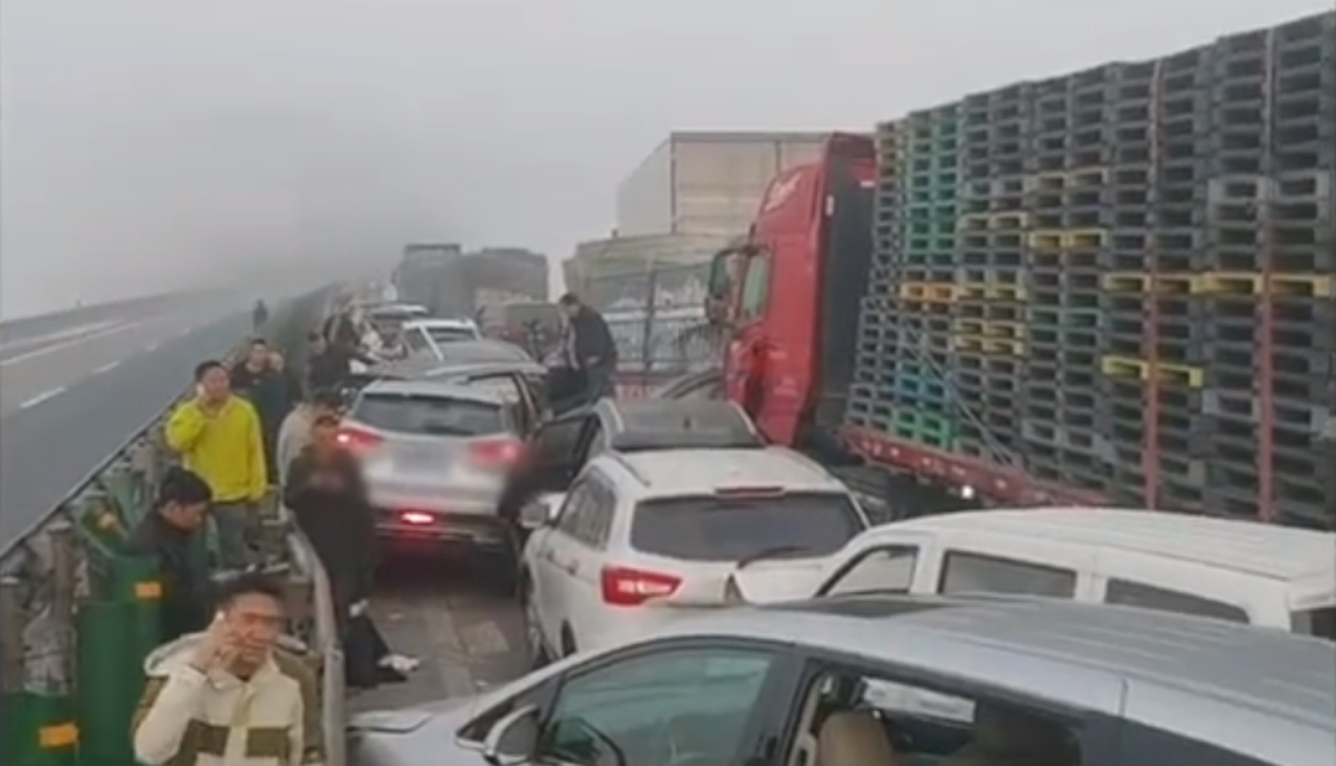 ! q+ R; h- T9 o+ }0 R網傳影片中,大量小型私家車被幾輛大貨車擠壓在內車道,無法移動,車頭、車輪等損毀嚴重。有車主從車頂逃生,許多人站在道路旁打電話求助。